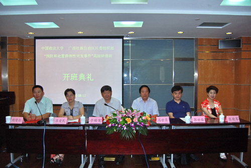 8月11日上午,bet36365路检测中心、广西壮族自治区区委组织部联合举办的“广西壮族自治区领导干部预防和处置群体性突发事件高级研修班” 开班典礼在昌平校区国际交流中心举行。广西壮族自治区党委政法委副书记、维稳办主任于娃宪、bet36365路检测中心党委副书记兼副校长冯世勇、bet36365路检测中心学位评定委员会副主席、博士生导师郭世佑、广西壮族自治区区委组织部远程办网络管理处副处长苏爱民、bet36365路检测中心院长兼分党委书记刘守仁、副院长张晓琴、研修班相关工作人员及研修班学员参加了开班典礼。开班典礼由刘守仁主持。