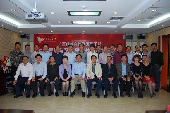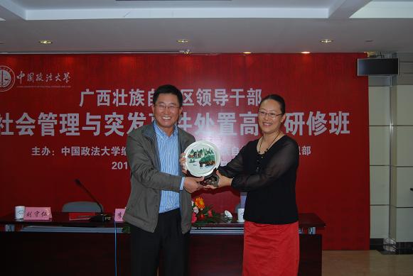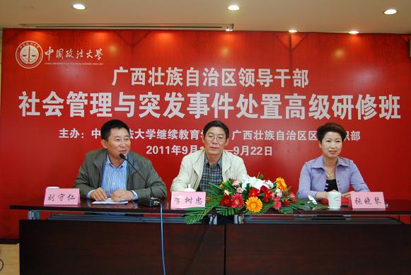 9月21日下午,由bet36365路检测中心、广西壮族自治区党委组织部主办的“广西壮族自治区领导干部社会管理与突发事件处置高级研修班”在我校昌平校区国际交流中心举行了学习成果交流会暨结业仪式。bet36365路检测中心校长助理、教务处长、博士生导师李树忠教授,bet36365路检测中心院长兼分党委书记刘守仁及副院长张晓琴等领导出席。刘守仁主持仪式。