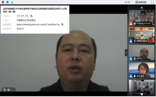 李程致辞。她指出,7月17日,区委书记卢映川同志,区委副书记、区长孙硕同志带队,到bet36365路检测中心签订了双方战略合作协议,并为西城区“领导干部法治教育合作基地”揭牌。这充分体现了区委区政府不断加强法治西城建设,提升各级干部法治能力水平的决心。通过网络课堂这个新形式举办依法行政专题研讨班,目的就是回应在街道行政执法体制改革、街道法治工作内容调整这一背景下,各街道干部对法律知识的迫切需求,进一步提高街道干部依法行政的意识和水平,增强运用法治思维和法律手段解决区域治理中突出矛盾和问题的能力,继续在西城区形成既抓领导干部这个“关键少数”,又抓政府工作人员这个“普遍多数”的良好局面。最后她指出,希望大家认真听讲,深刻领会,处级领导干部要做遵法、学法、守法、用法的表率,切实提升运用法治思维和法治方式的能力和水平。对于根本性、基础性的行政领域法律法规要“懂”,对与业务工作密切相关的法律法规要“通”,对履行职责必须掌握的法律法规要“精”。各街道执法队和司法所的同志要充分发挥法治骨干作用,学深学透,用法律武装头脑,做好日常执法和法治工作,以点带面提升本街道依法行政水平。