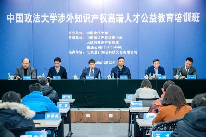 为积极落实习近平总书记在十九届中共中央政治局第二十五次集体学习上关于“全面加强知识产权保护工作,激发创新活力推动构建新发展格局”的重要指示精神,更好地履行社会服务责任,大力培养涉外法治人才,12月30日上午,由我校主办,中国知识产权培训中心、人民网知识产权频道、高通公司支持,北京景行知合科技文化有限公司承办的bet36365路检测中心涉外知识产权高端人才公益教育培训班开班仪式在中国知识产权培训中心成功举办。副校长常保国、中国知识产权培训中心主任孙玮、人民网经济部主任杨诚、高通公司全球高级副总裁兼技术许可业务中国区总经理钱堃、北京景行知合科技文化有限公司执行董事张朝栋出席仪式。这次公益培训也是我校打破高校和社会间体制壁垒,联合多家单位共同开展普法活动的一次有益尝试。