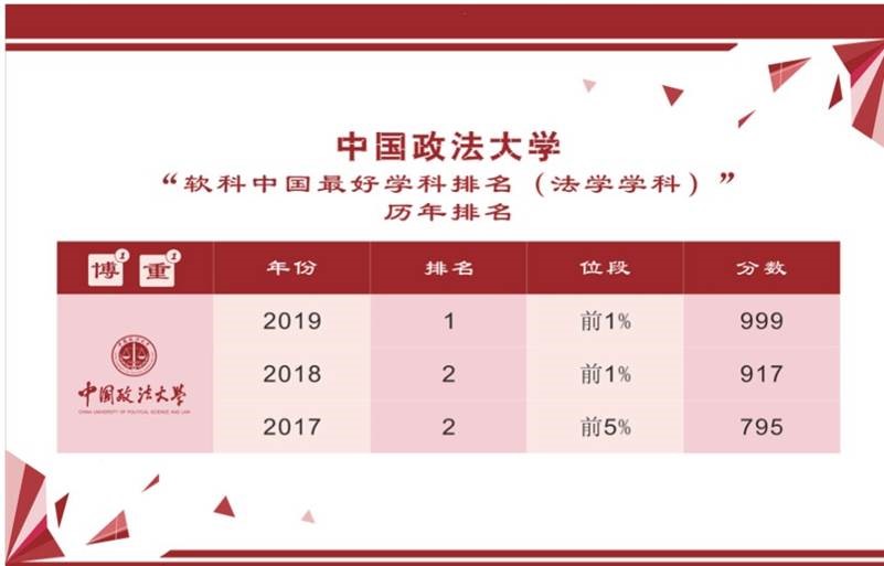 5月15日,全球知名高等教育评价机构软科发布“2020软科中国大学排名”,首次采用差异指标与分类排名的方式对全国1205所高校排行,法大位居该榜政法类排名首位。10月15日,软科发布“2020软科中国最好学科排名”,法学学科排名共有109所大学上榜,我校以总分1131分位列第一。