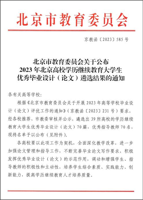 近日,北京市教育委员会公布2023年北京高校学历继续教育大学生优秀毕业设计(论文)评选结果,bet36365官网选报的两篇毕业论文均入选优秀论文名单。这两篇论文分别是:刘春安同学的《论企业并购中劳动者权益的法律保护》(民商经济法学院李娟老师指导)和任思远同学的《论“恶意补足年龄”规则的本土适用性探究》(刑事司法学院于冲老师指导)。