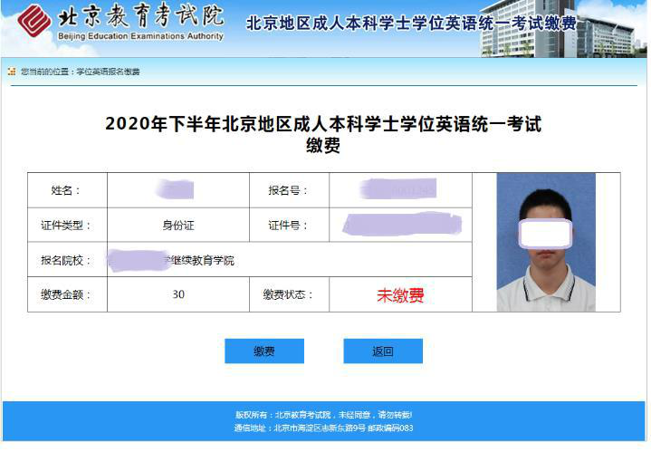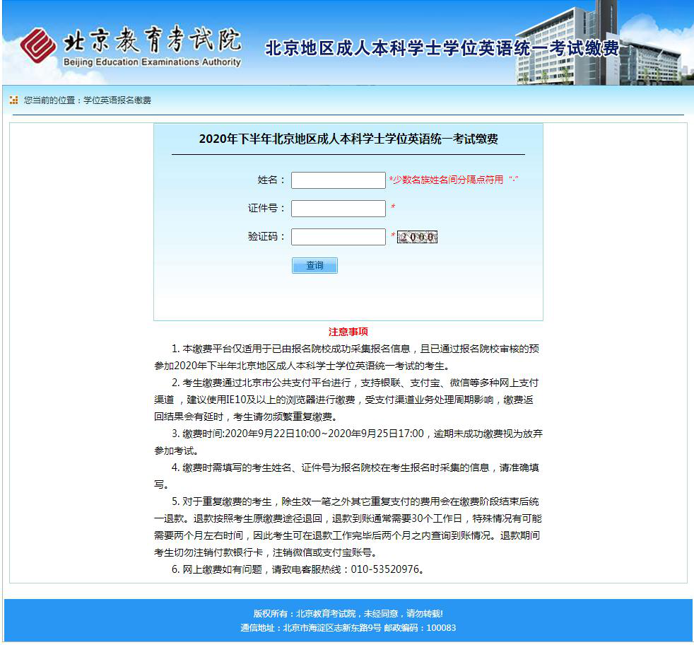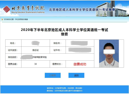 1. 缴费平台仅适用于已由报名院校成功采集报名信息,且已通过报名院校审核的预参加 2020 年下半年北京地区成人本科学士学位英语统一考试的考生。