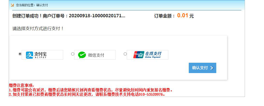 2. 考生缴费通过北京市公共支付平台进行,支持支付宝、微信、银联等多种网上支付渠道,建议使用 IE10 及以上的浏览器进行缴费,受支付渠道业务处理周期影响,缴费返回结果会有延时,考生请勿频繁重复缴费。建议使 用支付宝和微信方式,银联支付渠道返回结果较慢。