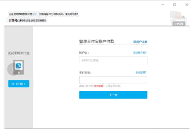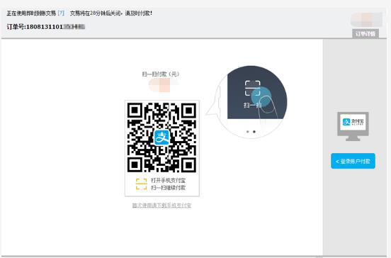 支付宝支付方式:如选择“支付宝”,请用手机“支付宝”APP 扫码屏幕中二维码,或点击“登陆账户付款”按钮,登录支付宝账户进行付款。