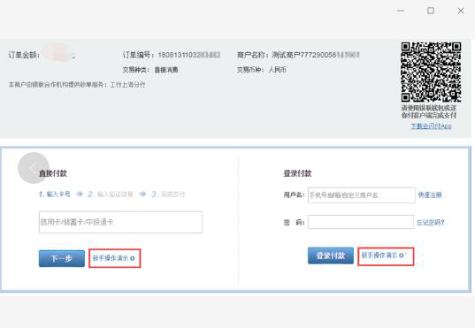 在线支付方式:如选择“在线支付”,请使用带有银联标志的银行卡进行直接付款或登录银联账号进行付款。具体操作方式请点击“新手操作演示”进行观看。