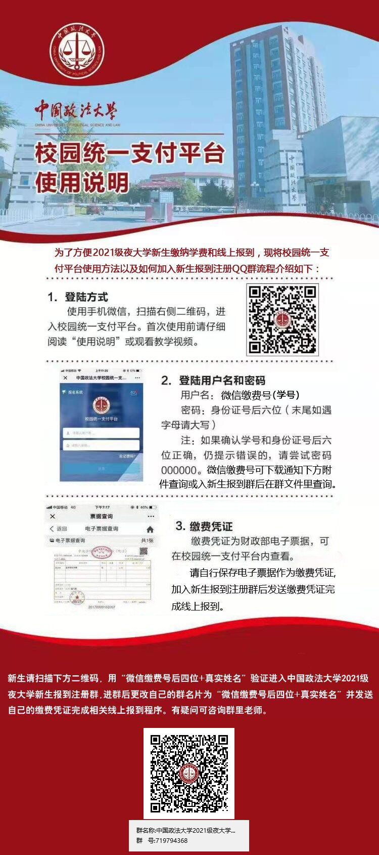 鉴于目前正处于疫情防控的特殊时期,学院决定2021级夜大学新生通过线上进行报到注册,请大家及时关注以下注册缴费流程,按时入QQ群进行线上报到注册缴费(缴费流程及线上报到群,详见通知下方图片),以免影响后续线上课程安排。