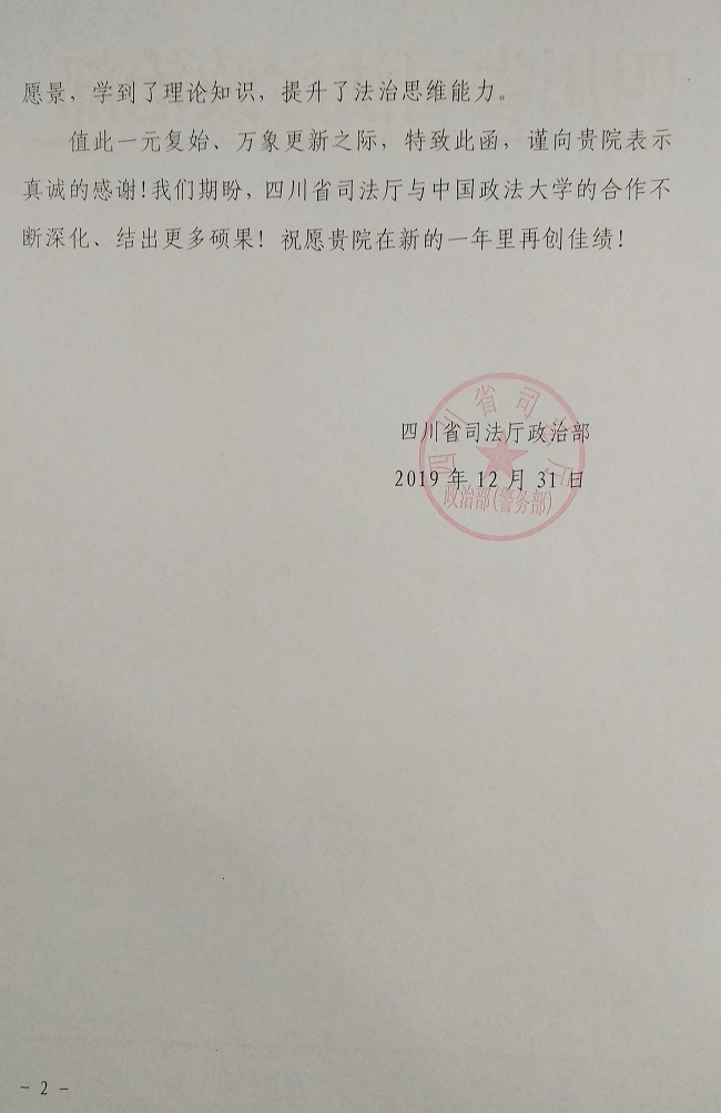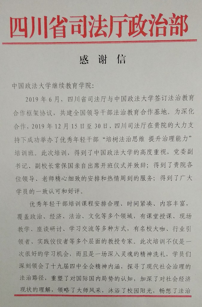 2019年12月31日,一元复始、万象更新之际,四川省司法厅政治部致信bet36365官网,对学院在四川省优秀年轻干部“培树法治思维 提升治理能力”培训班开班期间精心、细致的安排和热情周到的服务致以衷心感谢,并对此次培训班取得的良好预期效果表示肯定。