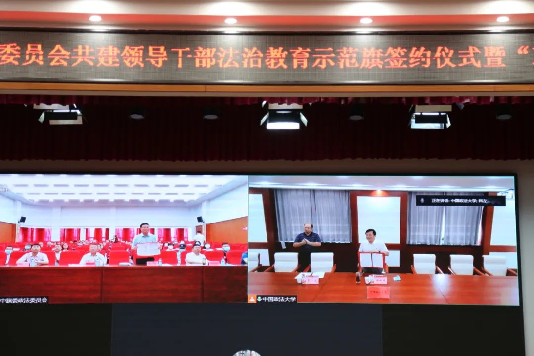 冯世勇和于勇分别代表双方远程签订《bet36365路检测中心与中共科左中旗委员会共建领导干部法治教育合作示范旗协议》。