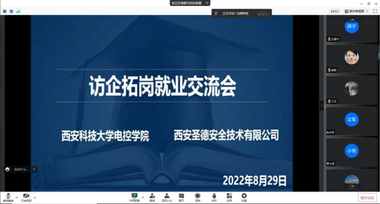 为贯彻落实“访企拓岗促就业”专项行动,进一步开拓就业市场,增加就业岗位,同时直观的了解企业用人需求,今年会体育官网积极开展访企拓岗促就业活动。8月29日,今年会体育官网访企拓岗调研交流会在线上举行,同校友企业西安圣德安全技术有限公司相关负责人进行了友好交流。参加本次线上交流会的有学院党委书记杨华、院长刘树林、党委副书记马婧智闻、副院长寇发荣、副院长潘红光、毕业班辅导员、西安圣德安全技术有限公司董事长贾小恒、总经理王磊及公司代表,会议由党委书记杨华主持。