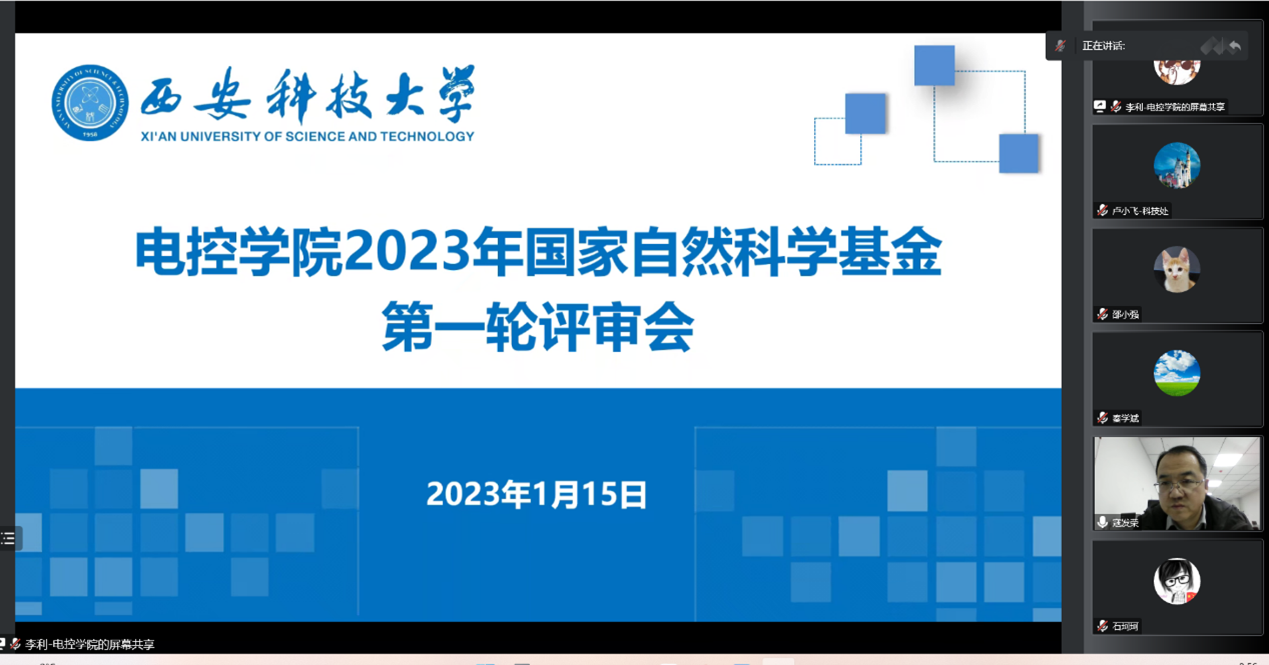 1月15日上午9点,今年会体育官网组织召开2023年国家自然科学基金评审会,邀请8位教授作为评审专家参与线上评审,分别是:上海交通大学邹媛媛教授;中国矿业大学孙彦景教授;西安电子科技大学孙伟教授;西安交通大学李振荣教授、宋国兵教授;西安理工大学张辉教授、同向前教授;沈阳工业大学佟文明教授。会议分为三个分会场同时进行,学院申报基金的全体教师参加。
