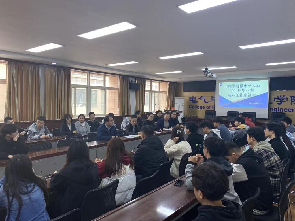 首先院长寇发荣为同学们讲解了当前的经济大环境及行业发展前景,期望同学们能调整就业目标,适合自己的才是最好的。随后院党委书记杨华通过讲述自身经历和成长择业历程,疏导考研失利学生的压力,同时也再次重申了“先就业后择业”的思想,祝愿所有微电子专业学生毕业都能有好的归宿。院党委副书记马婧智闻通报了专业同学们的就业情况和动态数据,建议未就业的同学向已经签约成功的同学学习面试技巧等,考研准备复试的同学更要好好准备,争取上岸。