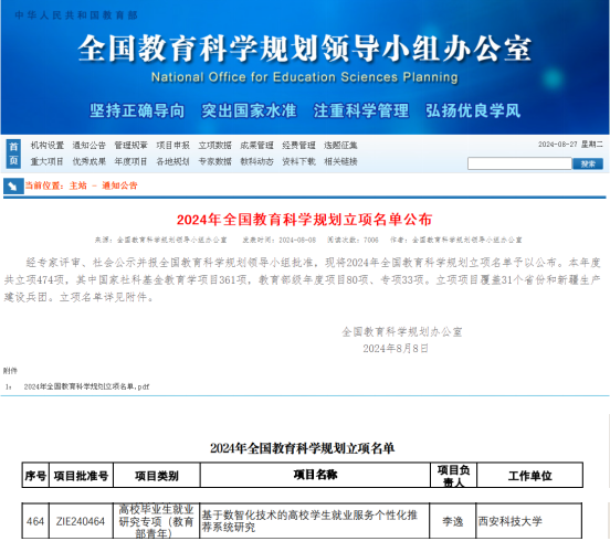 近日,全国教育科学规划领导小组办公室正式发布2024年全国教育科学规划立项名单,今年会体育官网辅导员李逸获批2024年全国教育科学规划项目高校毕业生就业研究专项(教育部青年项目),资助金额5万元。