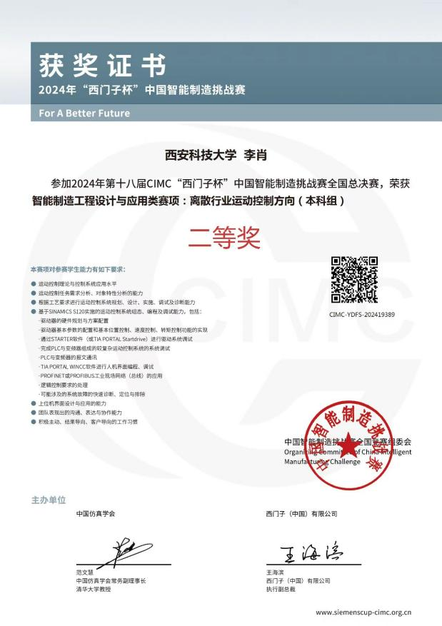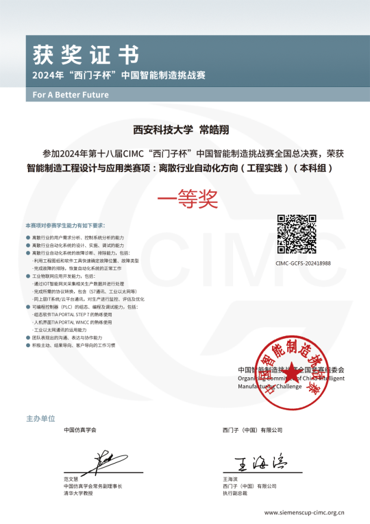 “西门子杯”中国智能制造挑战赛由西门子(中国)有限公司和中国仿真学会联合主办,自2006年发展至今,大赛已得到全国近900所高校的支持,大赛2010年被纳入教育部质量工程资助项目,在2012年被中国-欧盟工程教育论坛列为唯一的大学生竞赛项目,2017年起大赛纳入为中德高级别人文交流机制成果,2019年成为中国高等教育学会“全国普通高校学科竞赛排行榜”项目,是教育部认可的中国智能制造领域规模最大、规格最高的国家A类竞赛。