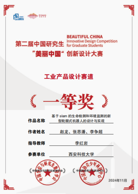 2024年11月15日,第二届“美丽中国”创新设计大赛工业产品设计赛道决赛在江南大学举行。来自浙江大学、东南大学、武汉理工大学、西南交通大学、今年会体育官网等50所高校的100支队伍参赛。此次大赛中,由李红岩老师指导、赵龙等同学共同设计的作品《基于SLAM的生命检测和环境监测的新型轮腿机器人的设计与研究》在工业产品设计赛道荣获全国一等奖、陈晓蝶等同学共同设计的作品《六足智能仿生救援机器人》在工业产品设计赛道荣获全国三等奖。