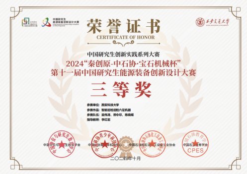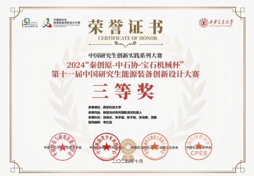 “秦创原-中石协·宝石机械杯”第十一届中国研究生能源装备创新设计大赛决赛已于2024年10月18日至20日在西安交通大学圆满结束。共有来自290所研究生培养单位参赛队伍进入决赛。此次大赛中,由李红岩老师指导、徐保庆等同学共同设计的作品《新型光伏阵列智能清洁机器人》和梁伟涛等同学共同设计的作品《智能巡检巡检机器》荣获全国三等奖。我校获得优秀组织单位。