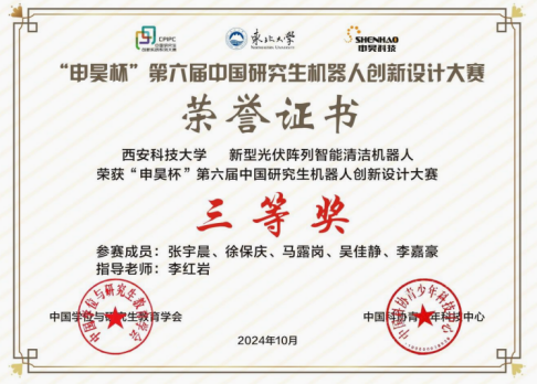 “申昊杯”第六届中国研究生机器人创新设计大赛全国总决赛于2024年10月23日-26日在辽宁沈阳举办。此次大赛中,由李红岩老师指导、张宇晨等同学共同设计的作品《新型光伏阵列智能清洁机器人》荣获全国三等奖。我校获得优秀组织单位。