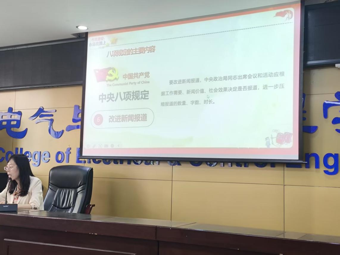 周静老师从两会召开的时间、议程、回顾过去的成绩以及后期工作部署等方面对两会精神进行了解读,深入讲解了工作报告中的亮点和重点。结合当前正在开展的深入贯彻中央八项规定精神学习教育,周静老师详细解读了中央八项规定出台的历史背景、本质要求和精神内涵,并结合科研经费管理、师德师风建设等高校领域出现的典型案例,给学院教师上了一堂精彩的教育课